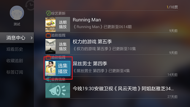 “历史收藏”中的“消息中心”中找到追剧提醒,点击“选集播放”即可。